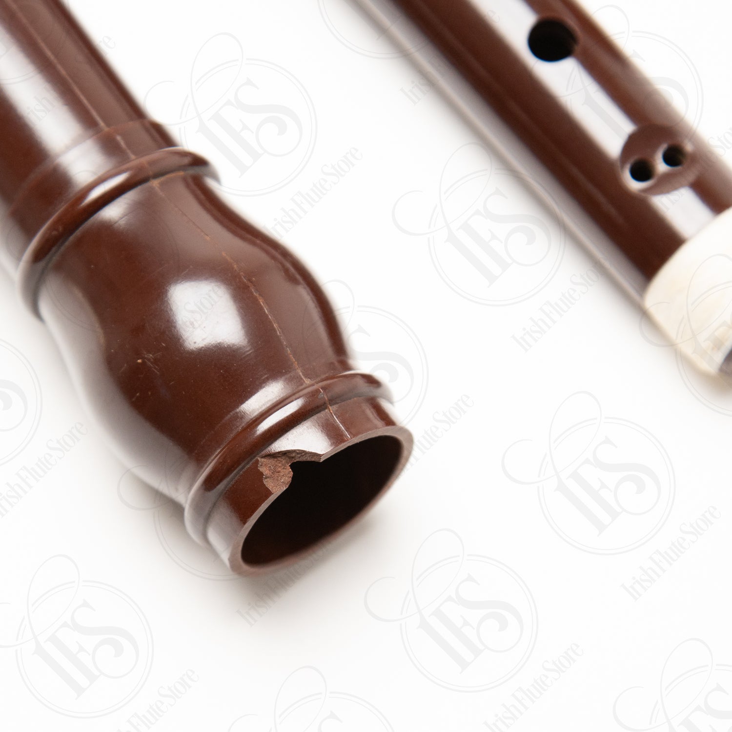 This is a vintage Dolmetsch plastic alto recorder pitched at A=415hz (low pitch). The instrument is in playable condition with a small chip in the socket that does not affect how it plays. The tenons are wrapped with thread, and the foot joint has an additional layer of teflon tape that has been added to improve the connection between joints.