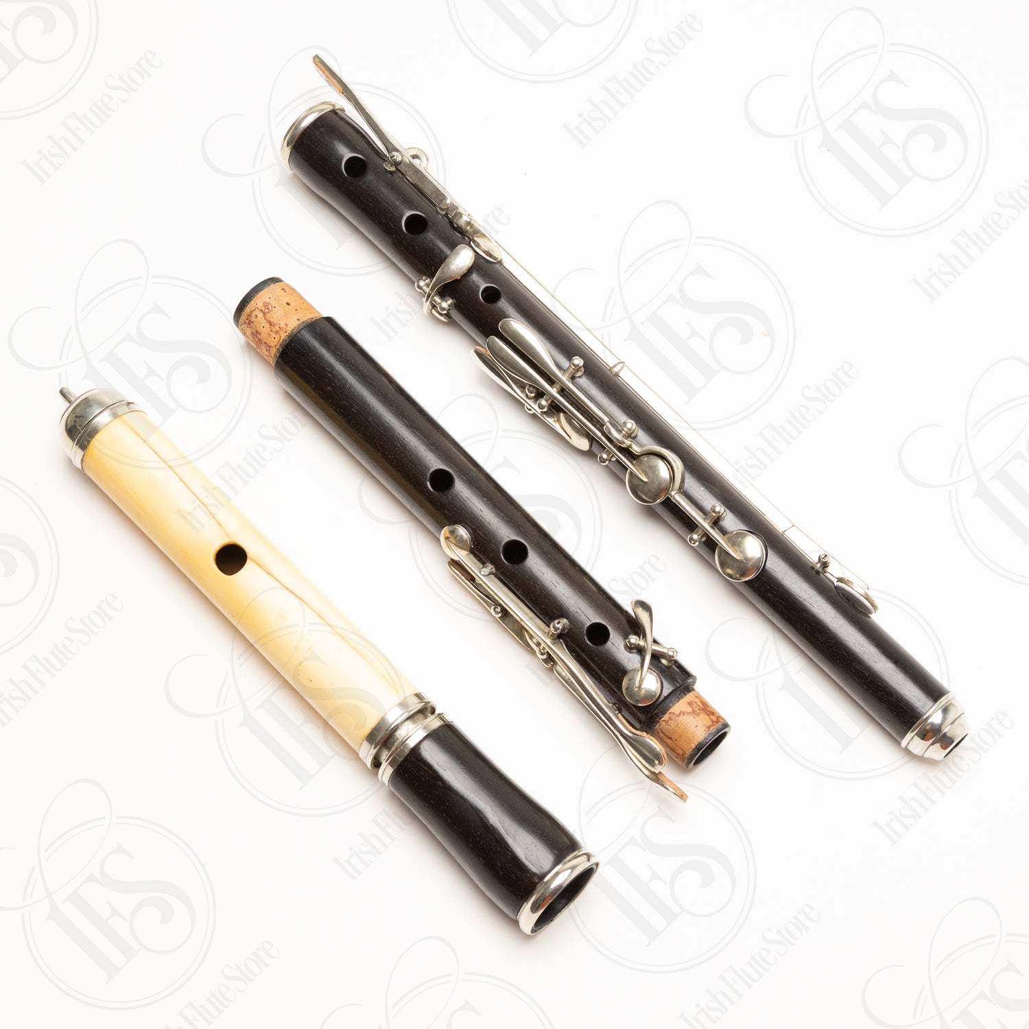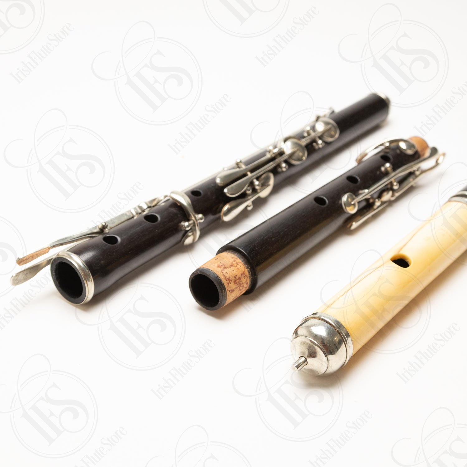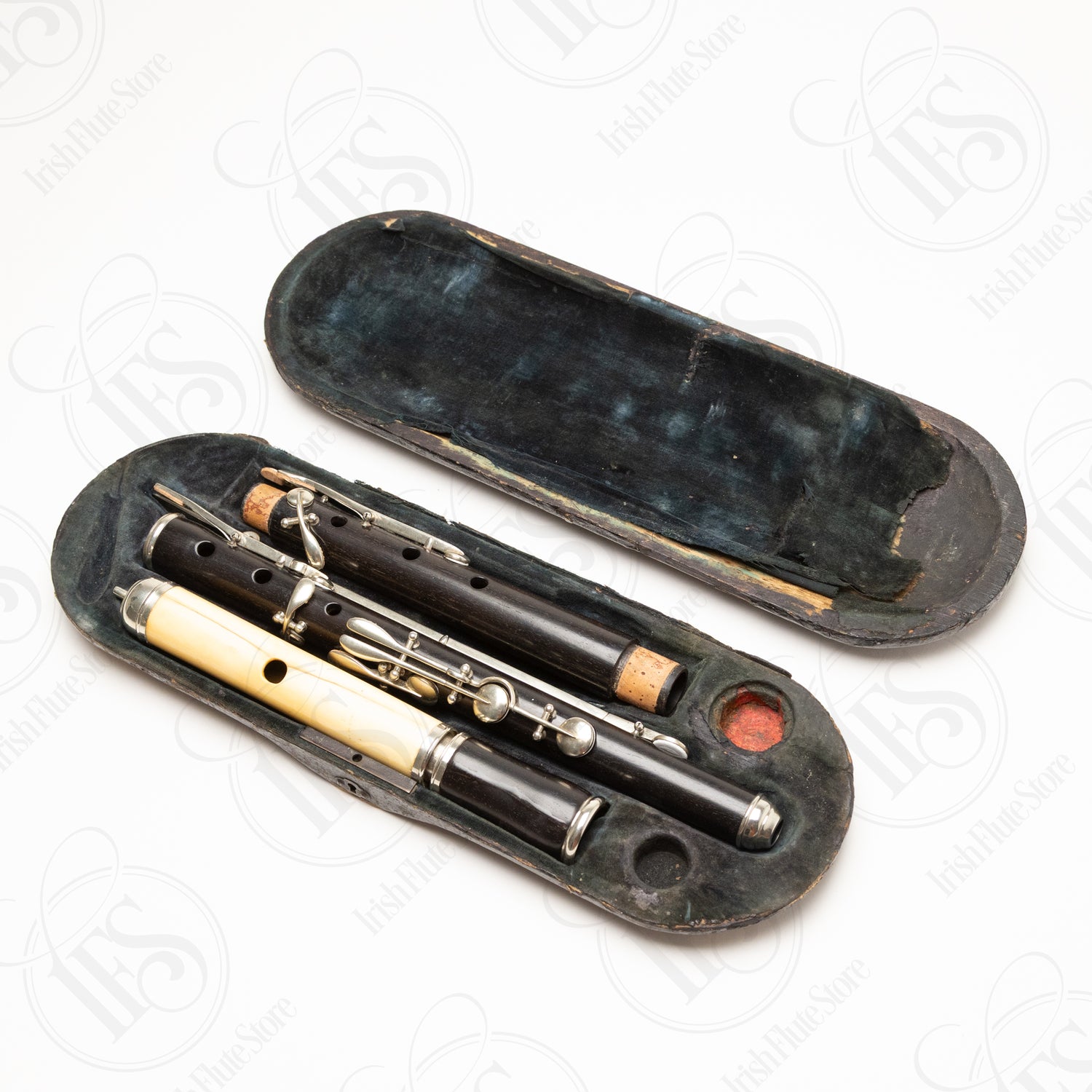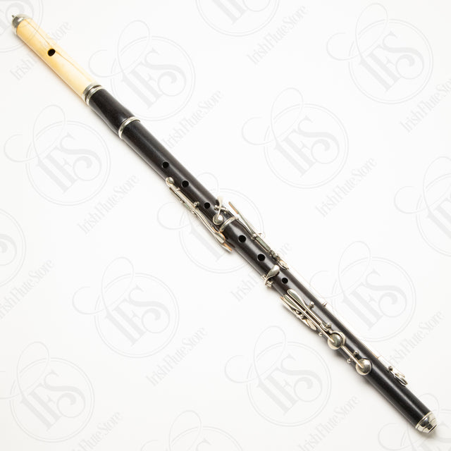 Nach Meyer flute with ivory headjoint. The instrument is in playable condition following an amateur repair. The headjoint has a repaired crack that runs through the embouchure hole, and the barrel has a sealed crack. The keys have fairly fresh pads. The flute plays at A440hz.