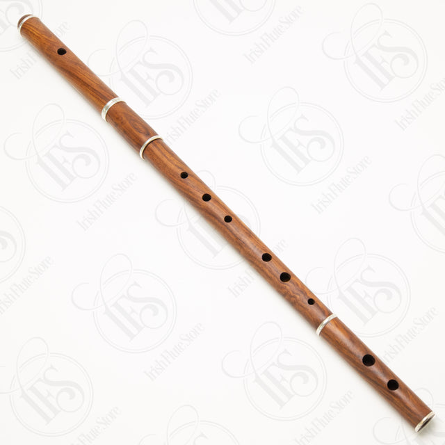 Pakistani-made rosewood flute with brass fittings and cork joints. Very nice playing flute with a mellow, warm tone. The embouchure is cut efficiently and is reasonably responsive. Tunes to A440 with head joint fully inserted once warmed up (plays slightly flat when cold). Good overall tuning with only minor adjustments needed on a few notes. A nice starter instrument for those beginning their journey on the wooden flute. Includes presentation box.