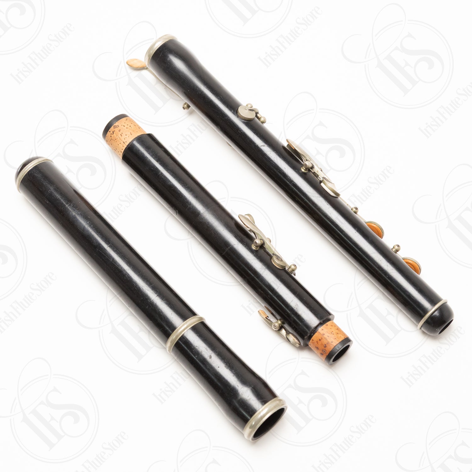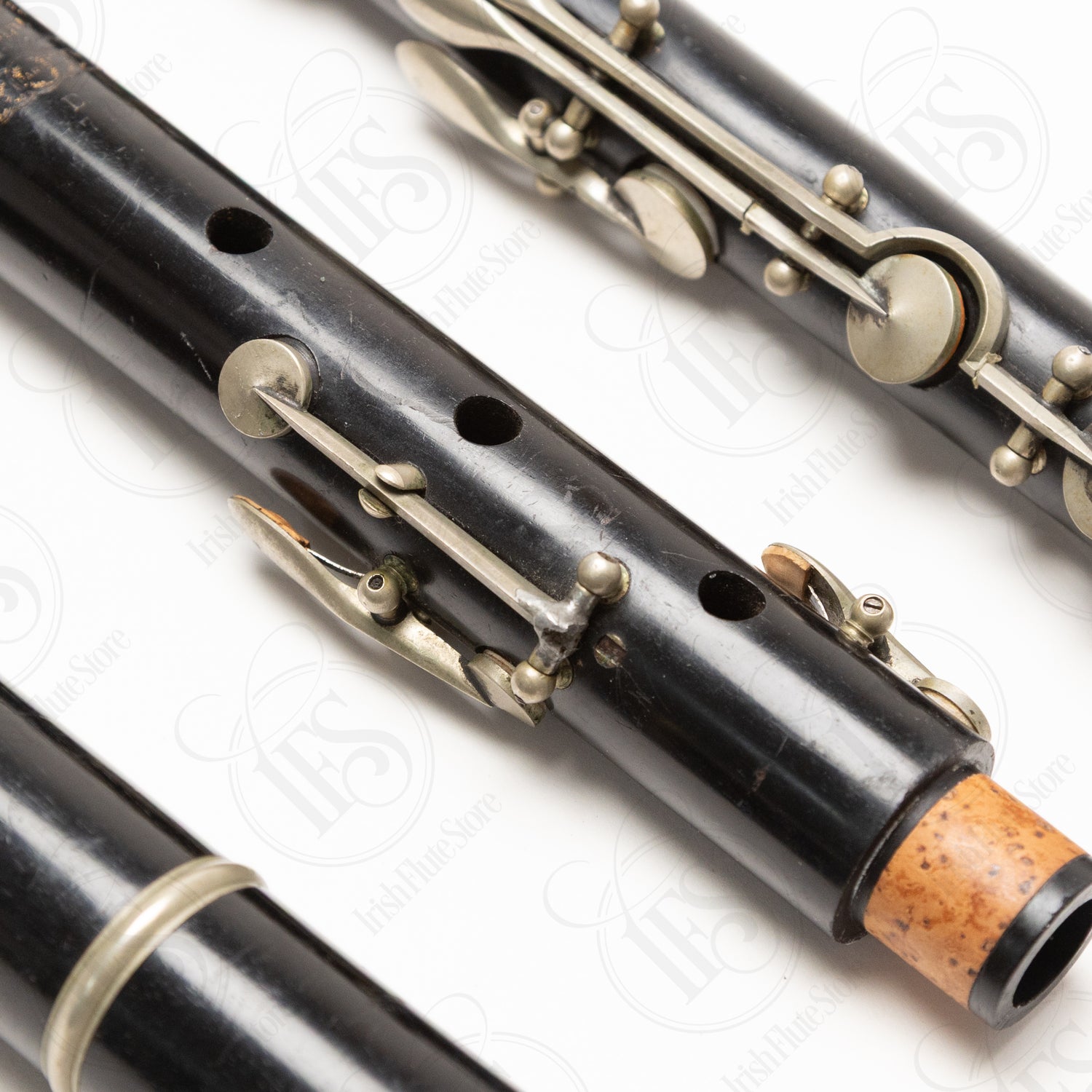 A solid restoration candidate with good bones. The flute plays well and produces a nice, deep sound, though the long C key is broken and will need to be refashioned. Some of the body rings are a little loose, and the instrument could benefit from an overall clean-up, polish, and likely a repad. The headjoint seals well.