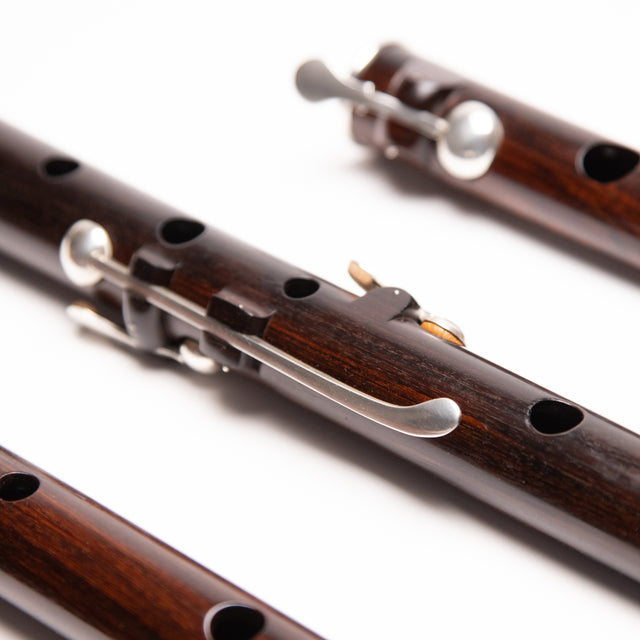 This Pat Olwell 5-Key Irish flute, crafted from rare instrument-grade cocus wood with silver keywork, includes an additional Eb section, also made from cocus. The lively, light feel of the cocus almost makes the flute zing in your hands when played. With excellent response and tuning, this flute delivers a rich, dynamic tone. The Eb section is particularly enjoyable, offering easy playability with an expressive sound. Cocuswood of this quality is exceedingly rare today, with makers often facing challenges in sourcing flawless pieces.