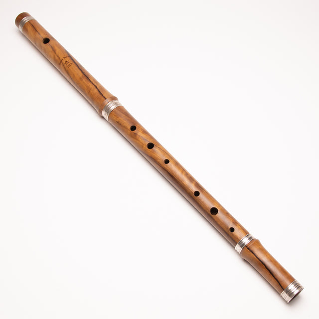 Beautifully figured Olive Wood. Mellow/soft player. This is using his standard finger spacing arrangement but has smaller hole sizing so is quite accessible for players with smaller hands/reach. Holes 3 and 6 are ever so slightly offset for ergonomics.