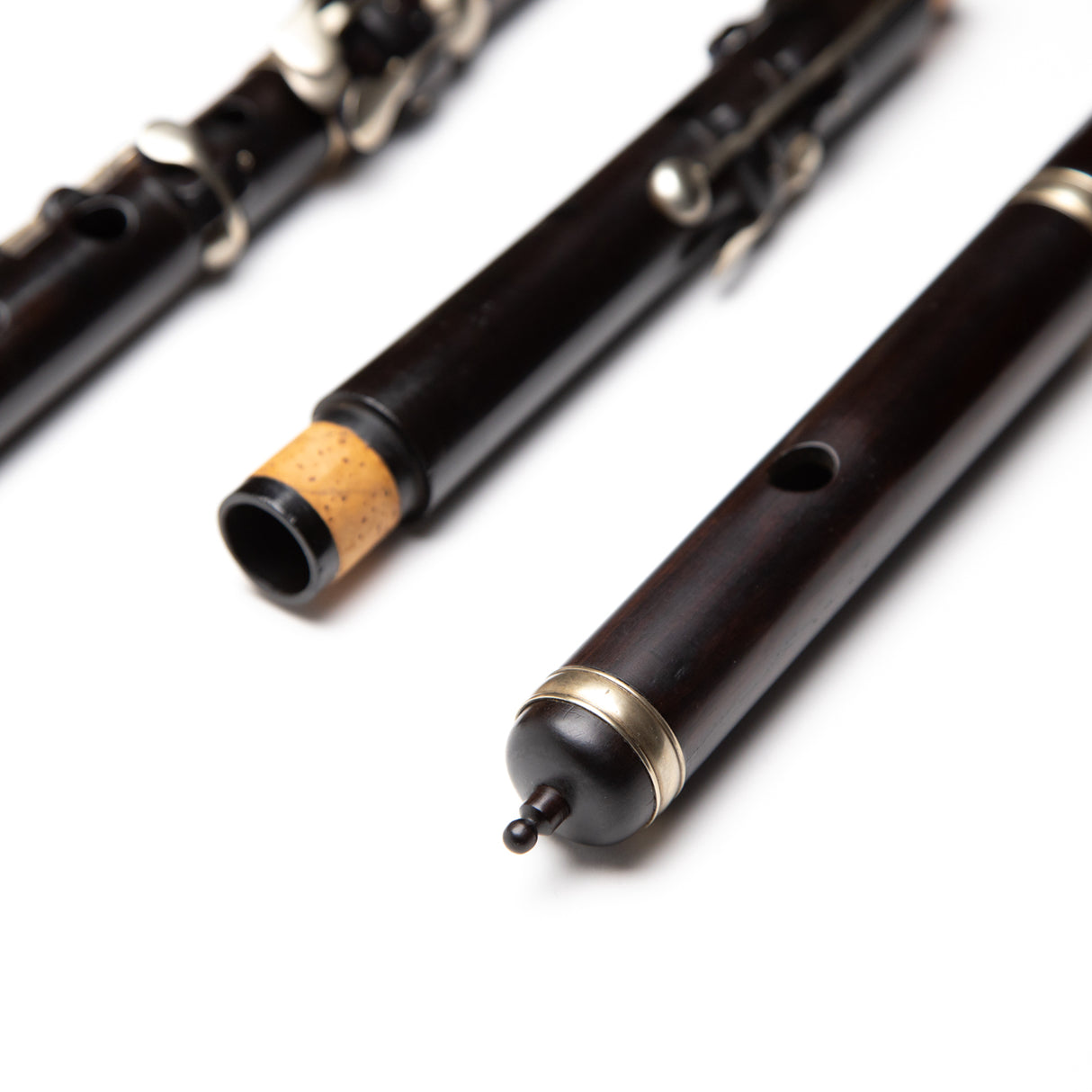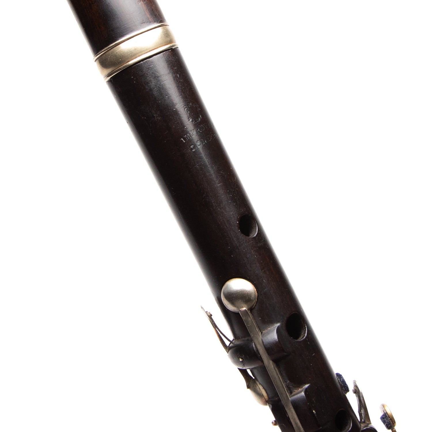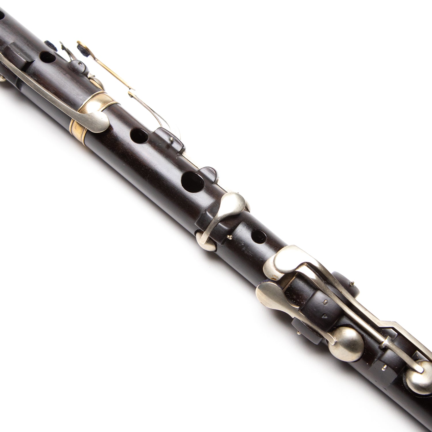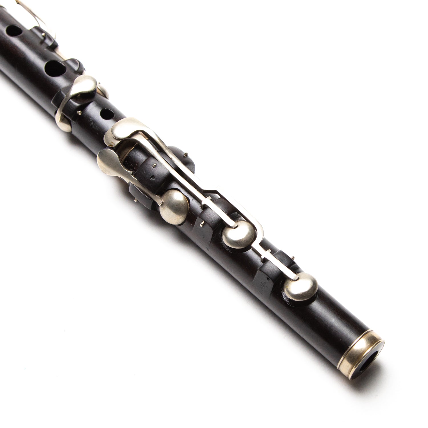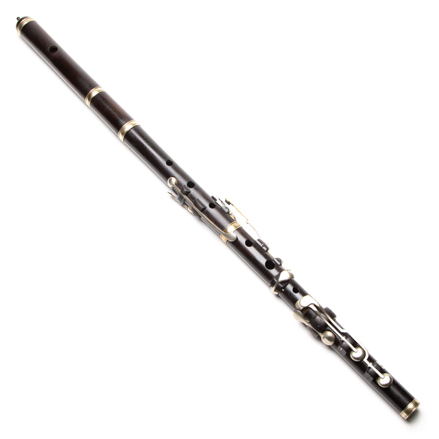 Condition: Antique. Fair. Has the usual repaired cracks in the headjoint and barrel. Crudely repaired long F key. Headjoint cork currently stuck in place. Position is slightly "right" of optimal. Sold as is but new owner is advised to address and possibly replace cork if damaged upon removal.