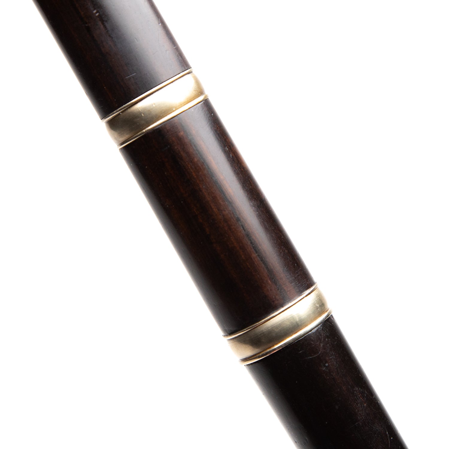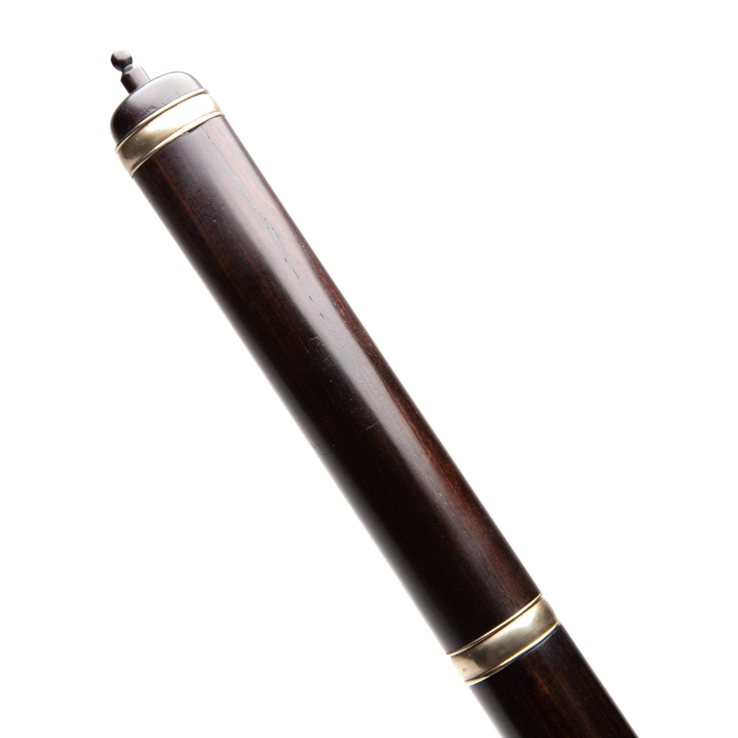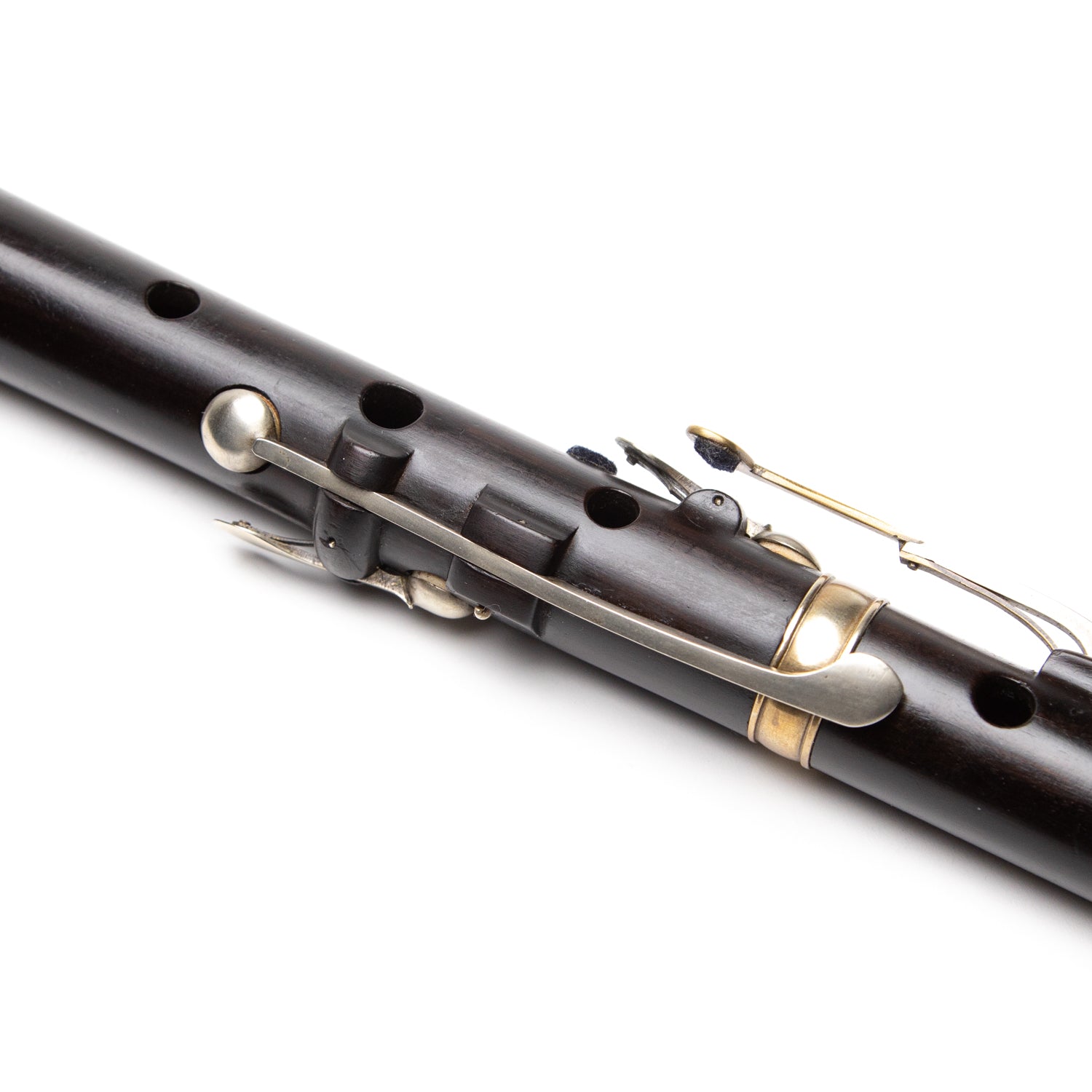 Make unknown. Stamped "Improved London". Cocus with nickel silver hardware. Intonation is actually fairly good other than a flat and slightly tender low D. Would make a good candidate to have further restoration work performed. Tender bottom D could be the result of sub optimal cork positioning, an air leak or perhaps slightly restricted bore. Overall tone and energy of the flute is very good otherwise and plays well at A440 with the slide extended only about 3/8"