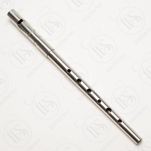Nickel high D whistle by Michael Copeland. Plays with good energy in the first octave while maintaining a sweet tone in the second. Upper notes, including high A and B, are easy to reach without excessive push. Excellent intonation and balanced response across both octaves.