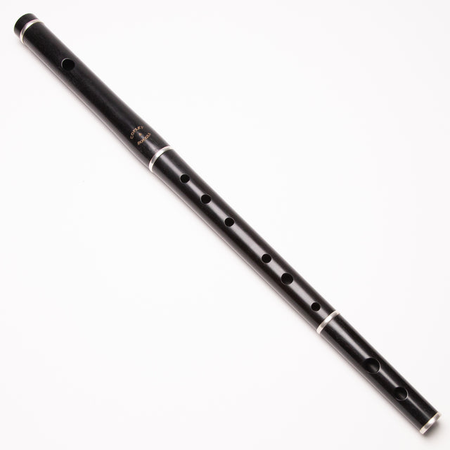 Lovely G flute by Copley and Boegli in African Blackwood with silver rings. Traditional embouchure cut and long foot for lovely tone and response. Very nice playing instrument. Delightful easy finger stretch and fast response on this small flute in the key of G. Excellent condition.