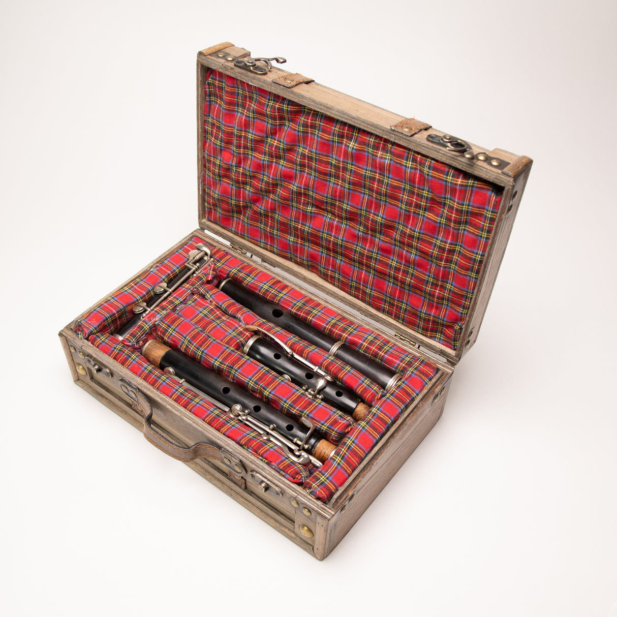 19th-century 10-key French flute, including the F# Tulou key. Plays at A=440 Hz with the slide extended 3mm. Recently restored, with new pads and cork, and hairline cracks in the barrel, right-hand, and foot sections sealed. Comes with a handmade case.