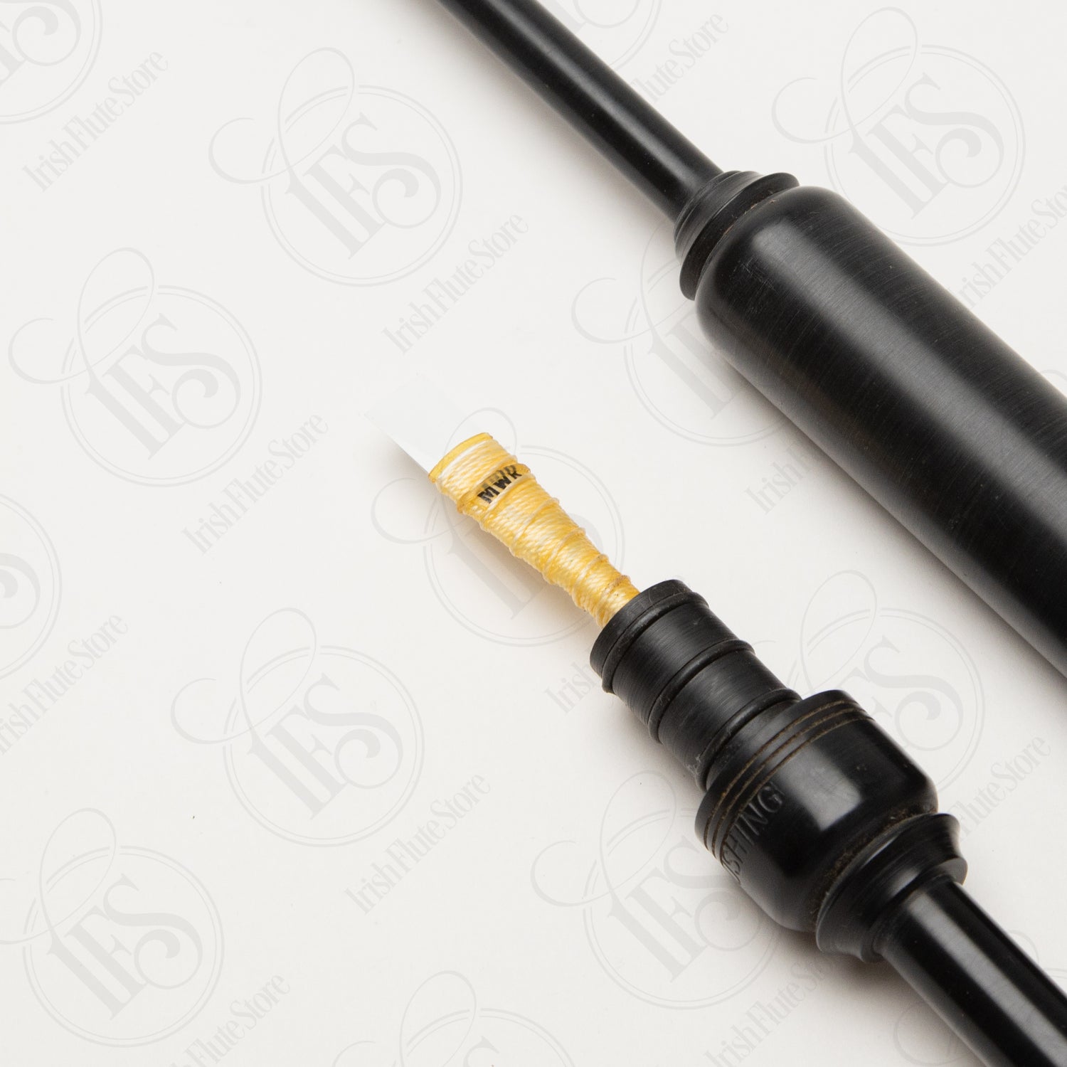This plastic practice chanter by Cushing is in good condition and includes a fitted plastic reed. Constructed to simulate the feel of a full pipe chanter, it features drilled-hole designs that replicate the larger chanter holes, offering a familiar finger spacing and comfortable feel.