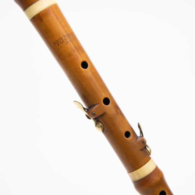 Four-key boxwood flute with brass keys, from the late/great Peter Noy collection. This flute has been fitted with new pads and corks. The boxwood body is light in the hands, delivering warm and rich tones. It is well-suited for players with smaller hands. The overall condition is very good, showing minor age-related markings but no visible repaired cracks. Tunes to A440hz with the headjoint extended approximately 3mm.