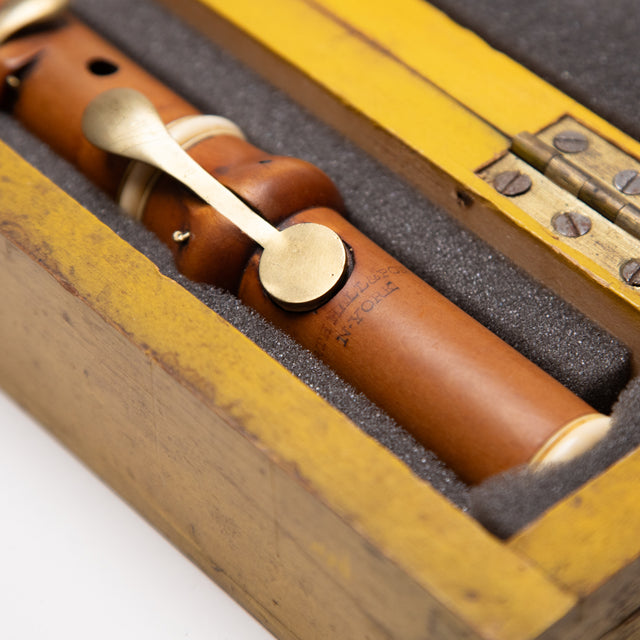 This flute is in remarkably good condition, with only a couple of hairline cracks in the right-hand section by the socket that have been sealed. It has been thoroughly inspected by antique flute restorer Jerry Schurr, who re-padded the keys, installed a new internal head cork, and cleaned and oiled the instrument. No further work or restoration is needed at this time. It comes with its original case, which, while not in great condition, holds historical value. Foam cushioning has been added for functionality, and it is secured with elastic bands, though a more thorough case restoration may be desired.
