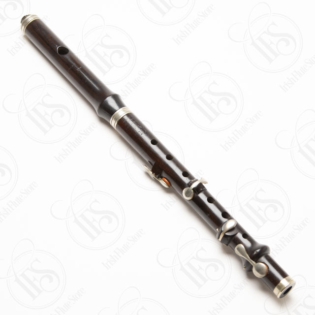 This antique 4-key fife by Hawkes & Son is crafted from cocus wood and features four block-mounted keys with German silver rings. It plays at high band pitch (A = 452 Hz). The headjoint bears a professional inscription, “Edgar Horne, Derry,” likely indicating the original owner. The body is stamped with the maker’s details from Denman Street, Piccadilly Circus, London, along with additional markings that may reflect regimental use.