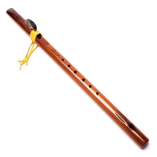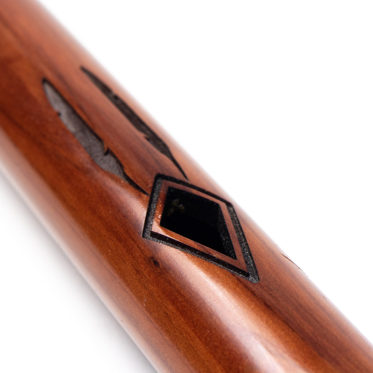 Crafted from domestic, aromatic cedar, a softwood, the wooden flute is sealed with non-toxic oils, which give it a warm, resonant and full voice. It is deeper in tone than the Red Tail Hawk.