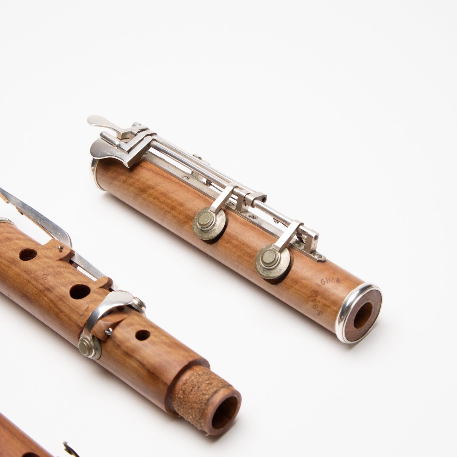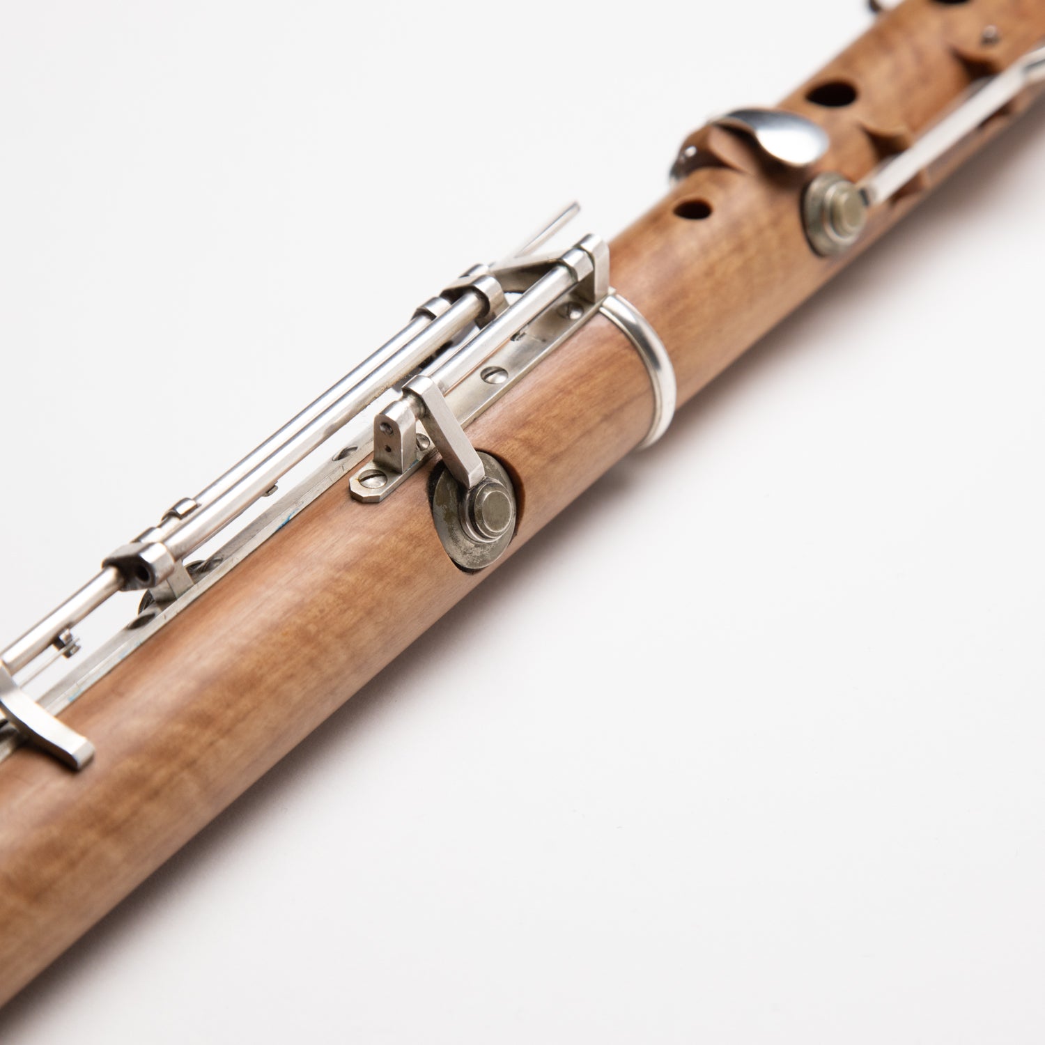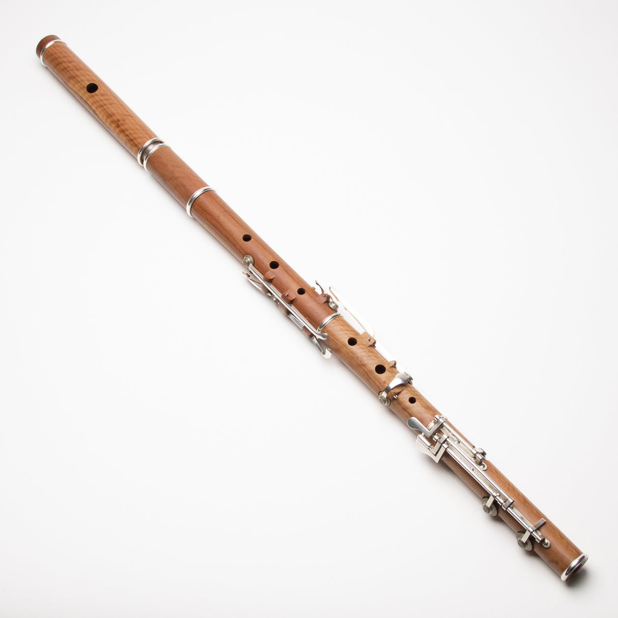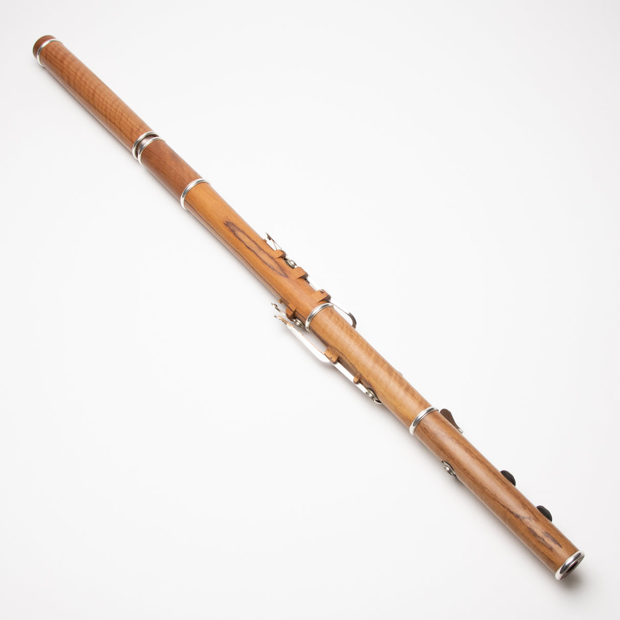 This is a one of a kind 9-key flute with a Boehm foot in olive wood, made by John Gallagher. It is his small-holed model, patterned after Chris Norman’s famous flute (Rudall & Rose #742). It has an additional Bb right hand lever and also features “upgraded” rings, with side lobes instead of the standard D shape. It plays beautifully and easily down to low C, with a particularly strong and powerful low D.