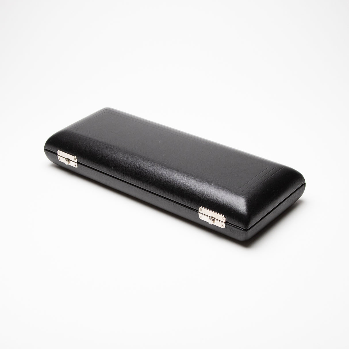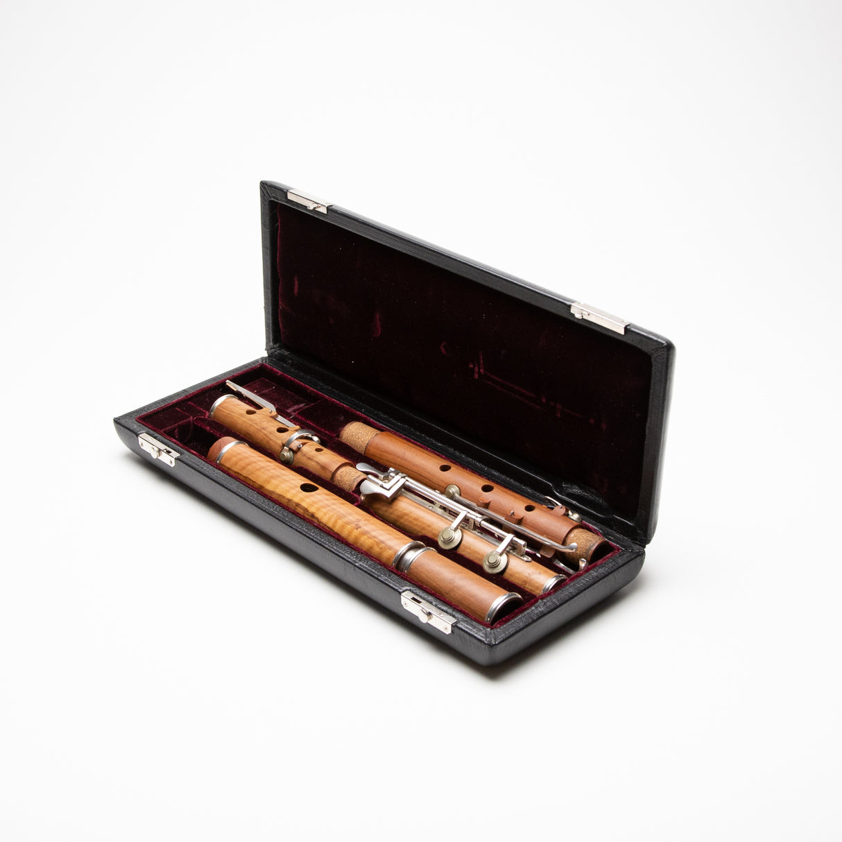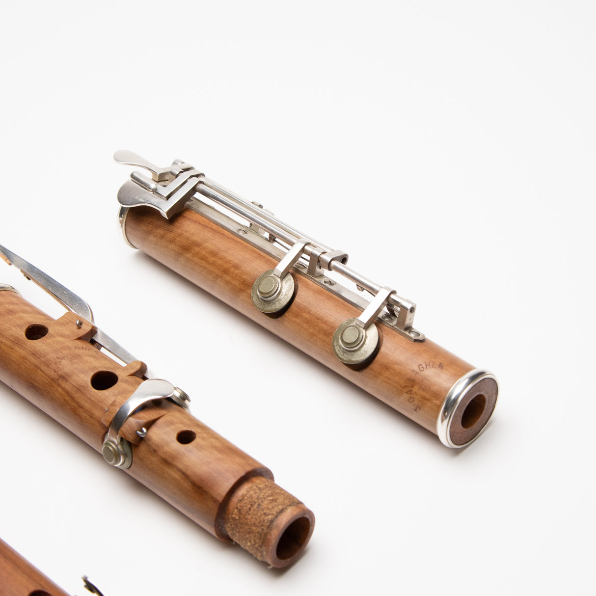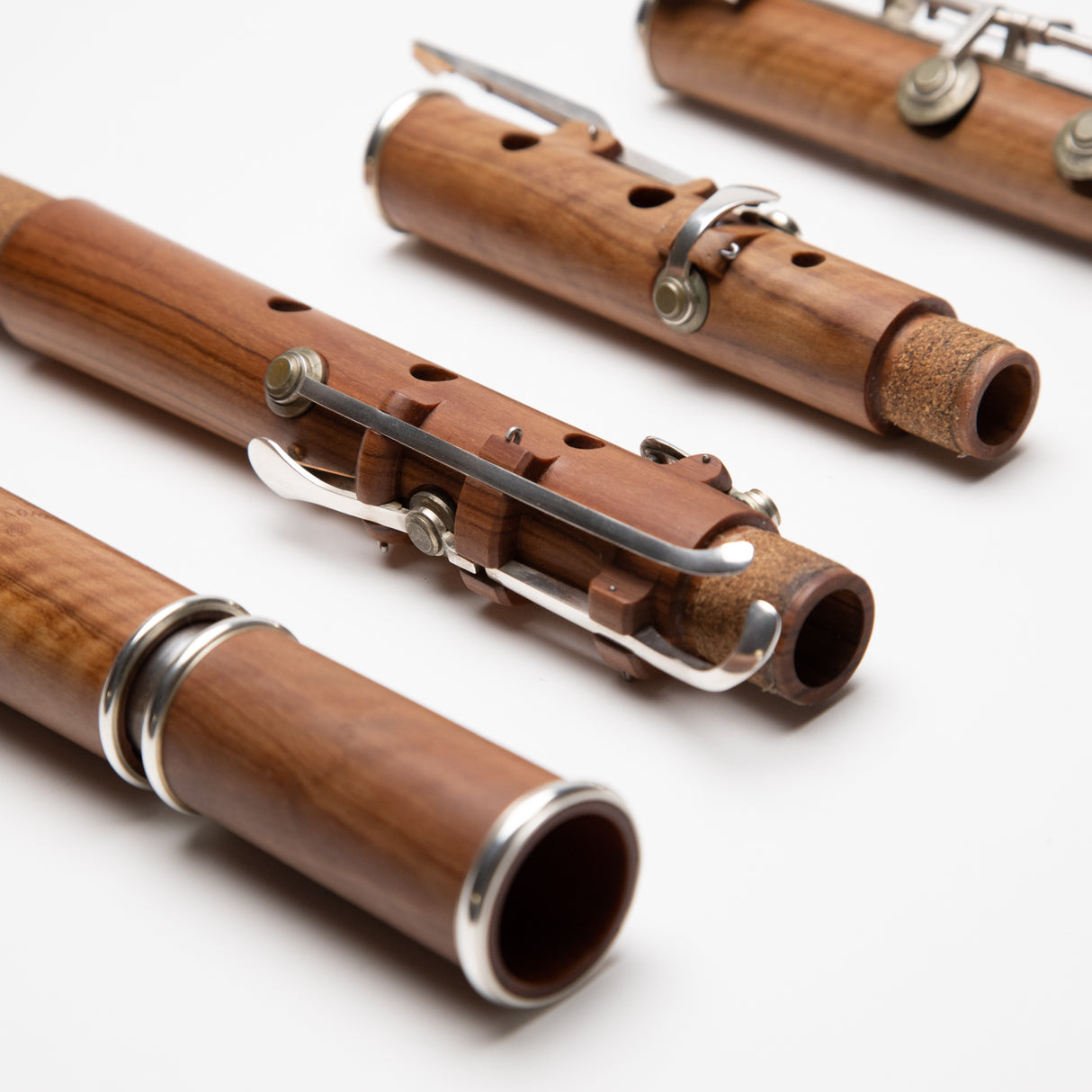 This is a one of a kind 9-key flute with a Boehm foot in olive wood, made by John Gallagher. It is his small-holed model, patterned after Chris Norman’s famous flute (Rudall & Rose #742). It has an additional Bb right hand lever and also features “upgraded” rings, with side lobes instead of the standard D shape. It plays beautifully and easily down to low C, with a particularly strong and powerful low D.