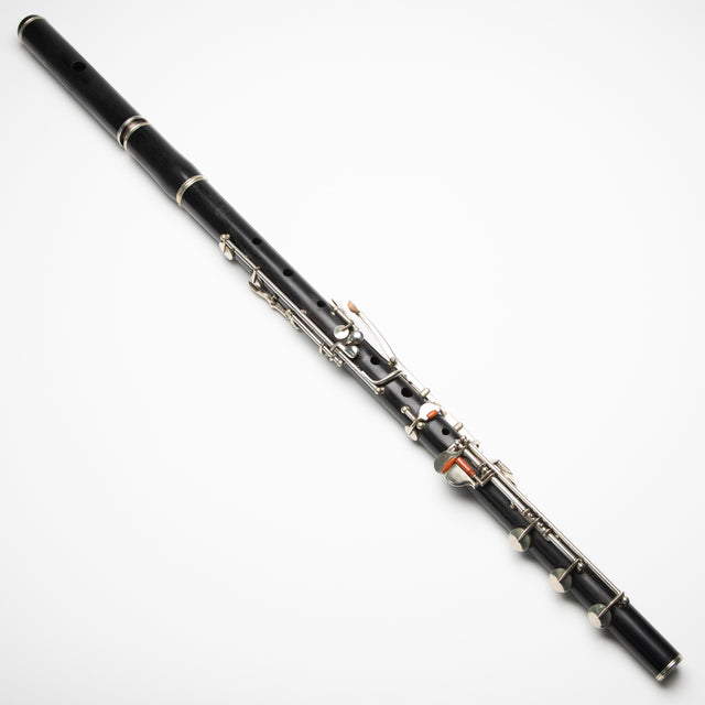 This Julius Zimmerman simple system flute, resembling a "Schwedler" design, is a fine example of late 19th-century refinements in flute-making from Germany and Eastern Europe. Crafted from blackwood with maillechort (nickel) fittings, it features a B foot and was produced between 1888 and 1930. While the Boehm flute was widely adopted by professional players in France and England during this period, traditional designs like this one remained popular in Eastern Europe, showcasing precision keywork and exceptional craftsmanship.