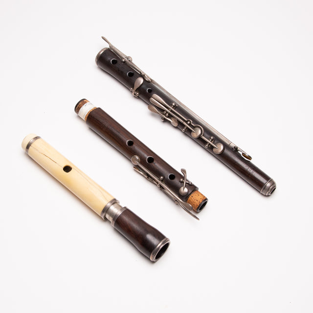This 9-key open hole flute was made by Meyer around 1870 in Hanover, Germany. It’s crafted from rosewood with an ivory head joint and has smaller finger holes typical of the time. The same owner has had it since 1983, and the previous owner mentioned it played well.