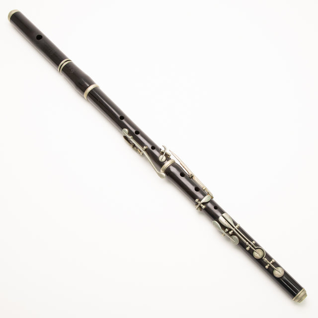 Antique flute, ideal for restoration. The headjoint has visible cracks on both the top and bottom (see photos), but no other cracks are noted. The rest of the flute is in good condition. This is a great option for someone seeking a fully keyed flute at a bargain price and willing to invest some effort into bringing it back to playing condition.