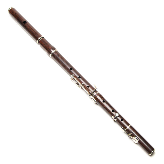 Awesome playing French Flute restored by Patrick Olwell. Full restoration included reboring, retuning & crack repair in barrel section (No cracks in headjoint!). Plays great at A440hz. Cocus wood & Nickel Silver. Has a larger embouchure than most French flutes which will suit most modern players. A great option for those wanting a responsive/resonant instrument with smaller holes.