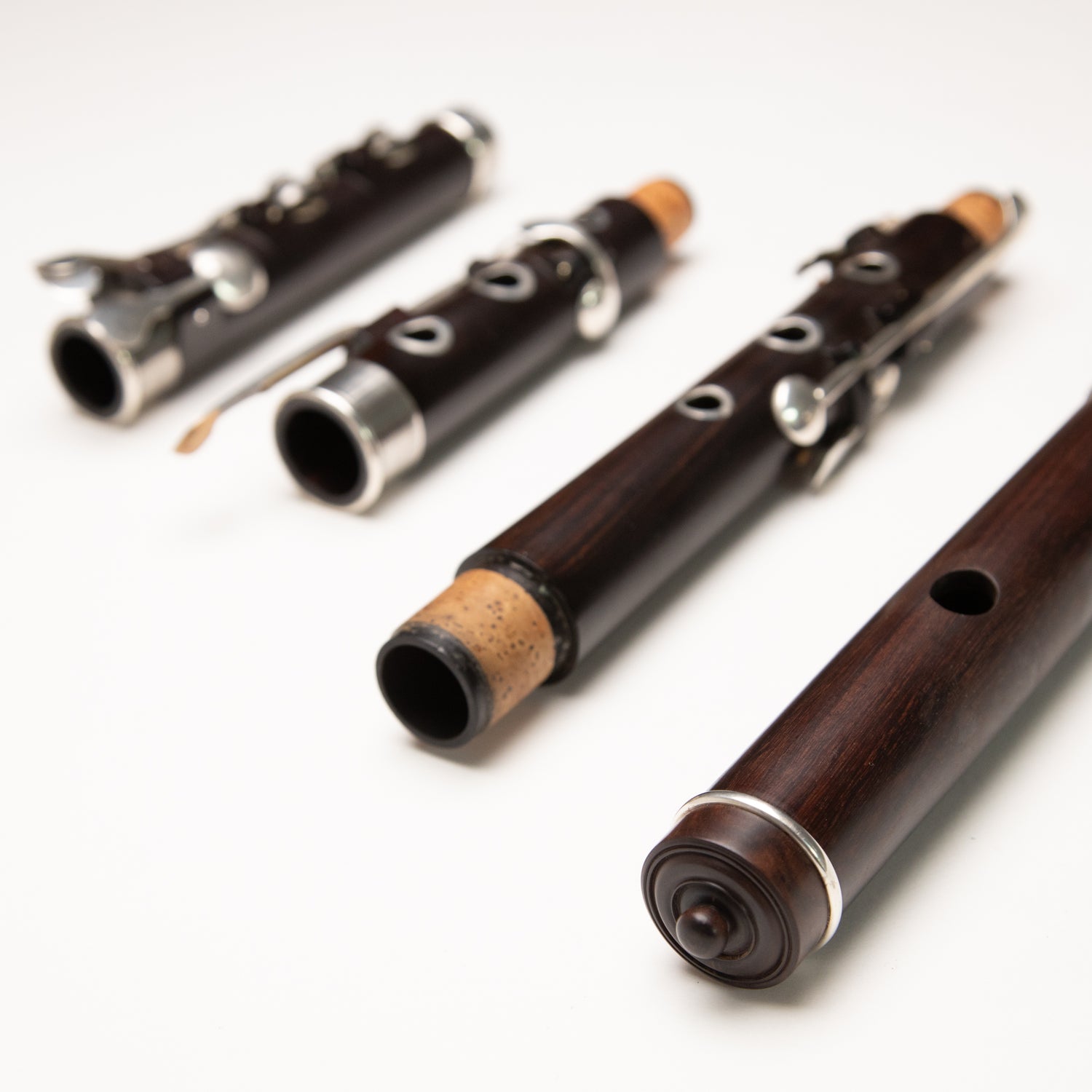 Patrick Olwell has meticulously refurbished this exquisite flute crafted from cocus wood and silver, featuring Rose engine engraved rings. The restoration includes the creation of a new Olwell stamped rosewood headjoint using the original fittings. The rosewood matches the original cocus wood very nicely. Additionally, Pat has conducted thorough fine reboring and retuning, enhancing the flute's performance to excel at A=440Hz.