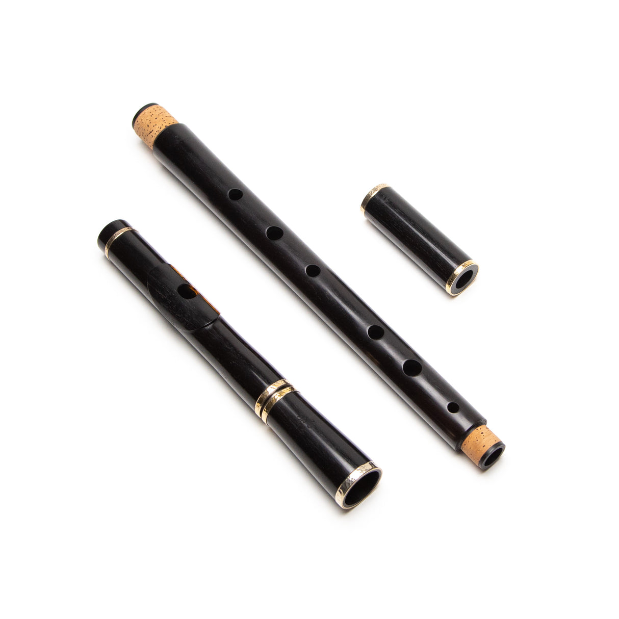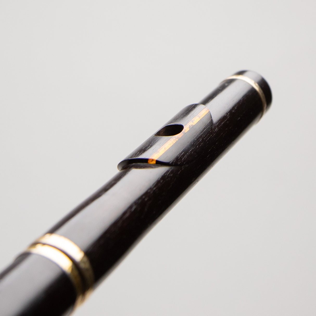 Wow. Plays as great as it looks! Peter's flutes are based on Nicholson type flutes (larger holed). Great power, tone & response throughout. Lively. This flute feature's Peter's fantastic X-Cut embouchure with a striking amber blow edge insert. Other custom features include hammered rings and an amber cabuchon on the end cap.