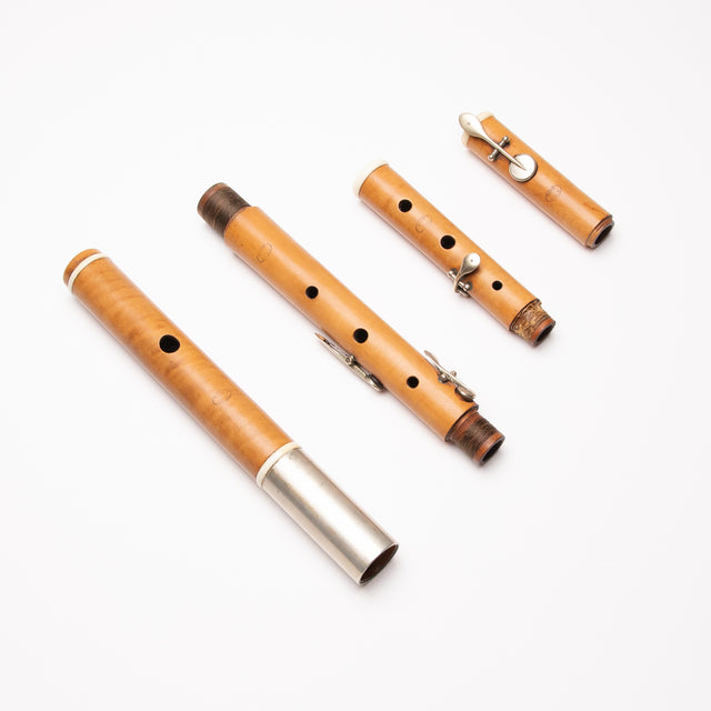 Condition: Missing a ring, with a headjoint that does not seal. The barrel had a previous crack, crudely repaired with a metal sleeve, and the barrel was sanded down to accommodate the sleeve. The instrument is not currently playable and requires rethreading of the tenons. The barrel section no longer functions as a tuning mechanism, as the headjoint has been glued to the barrel.