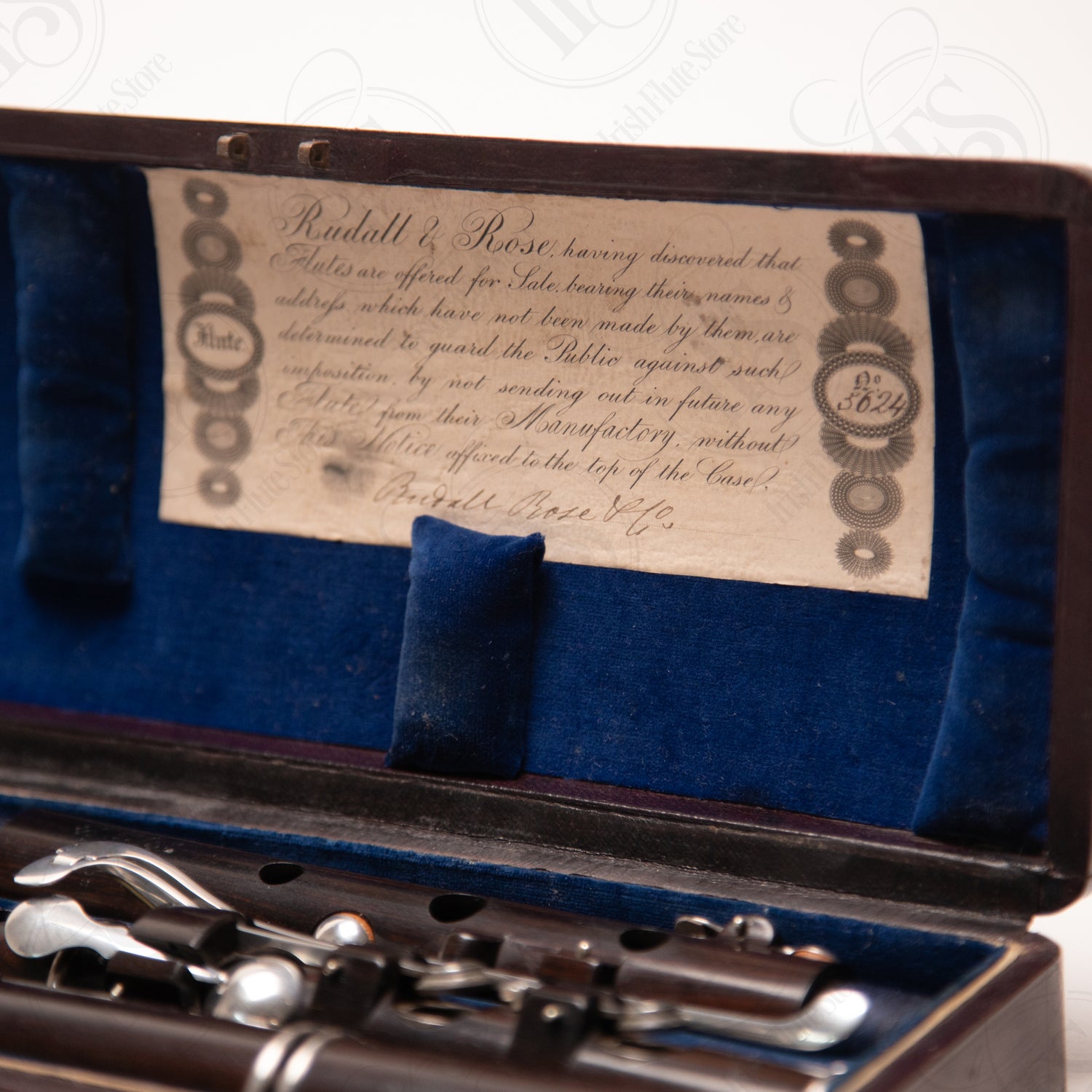 Rudall & Rose 8-Key Flute in Cocuswood and Silver, Serial No. 5624 (~1850). Sounding length: 572mm. Stamped (quatrefoil) Rudall & Rose / 38 Southampton St / Strand / London / (quatrefoil) / 5624. Includes original case with matching serial number.