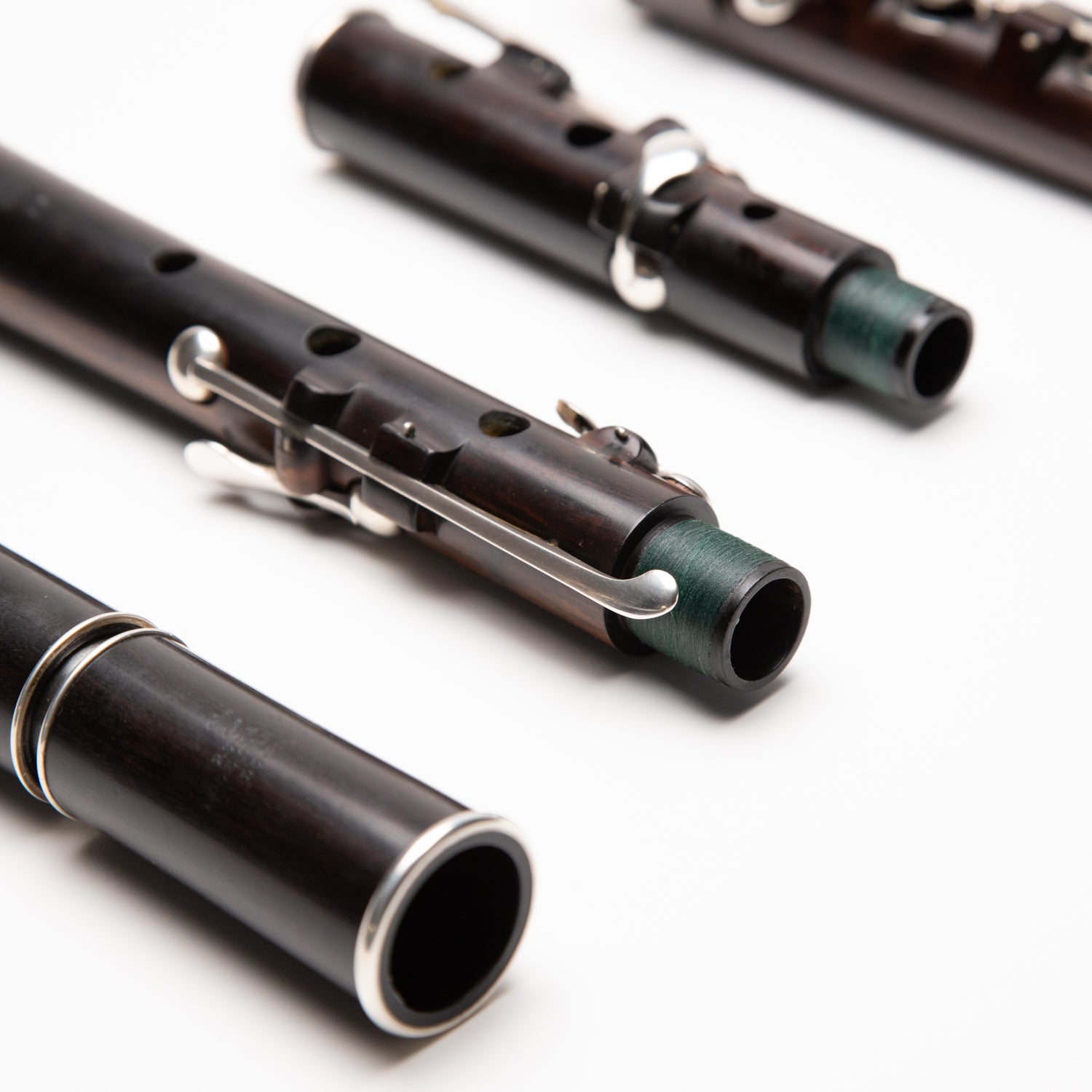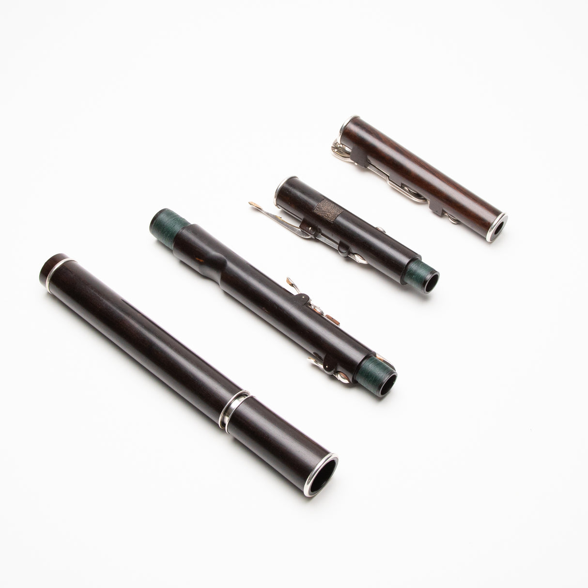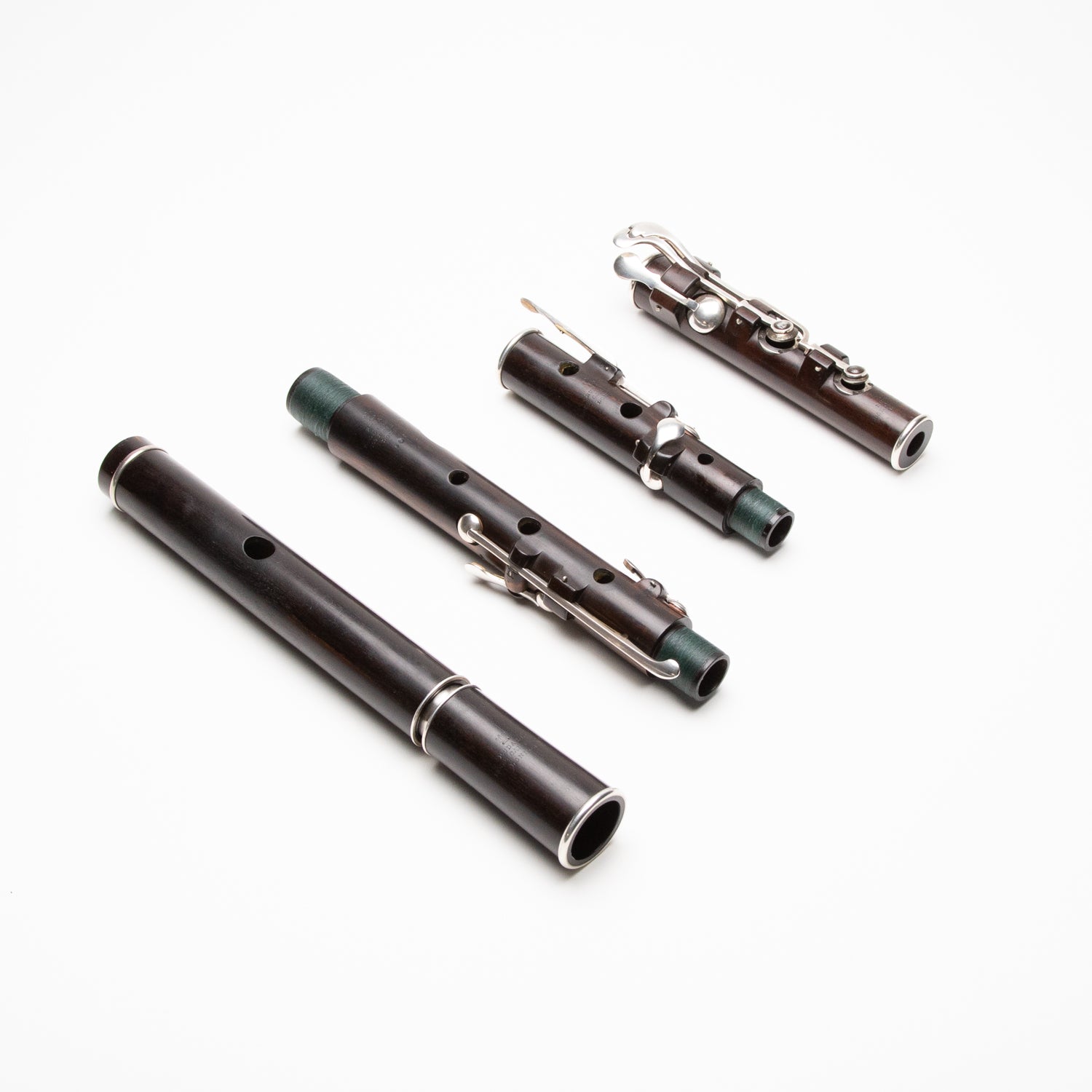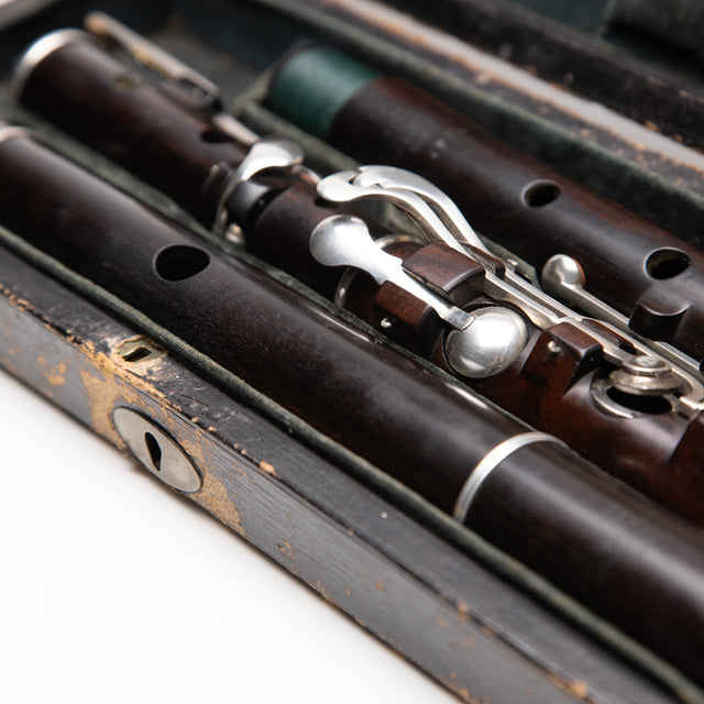 Condition: Antique ~1854 in excellent condition. Repairs to typical fine hairline cracks in barrel and back of headjoint. Recently overhauled by Jay Ham, who repadded it, changed the cork bumpers, adjusted key action, and retuned to bring it to modern pitch (using non-destructive shellac method). Plays at A440hz with slide extended approx 5mm.