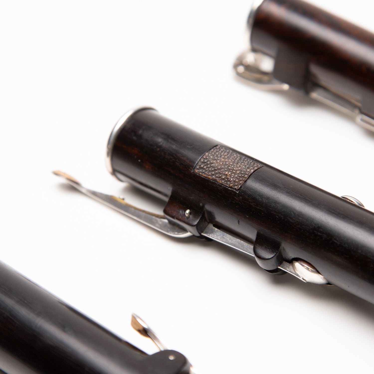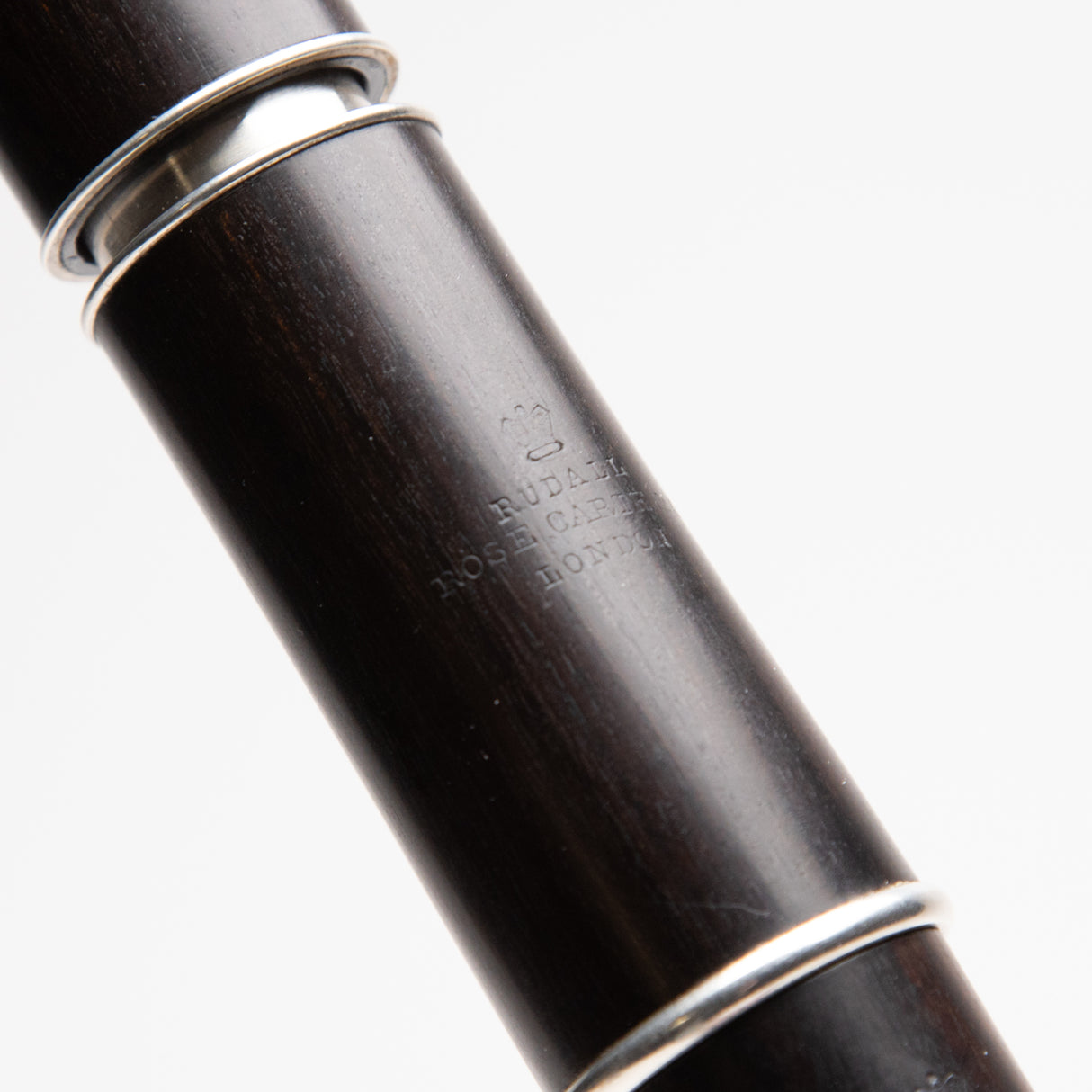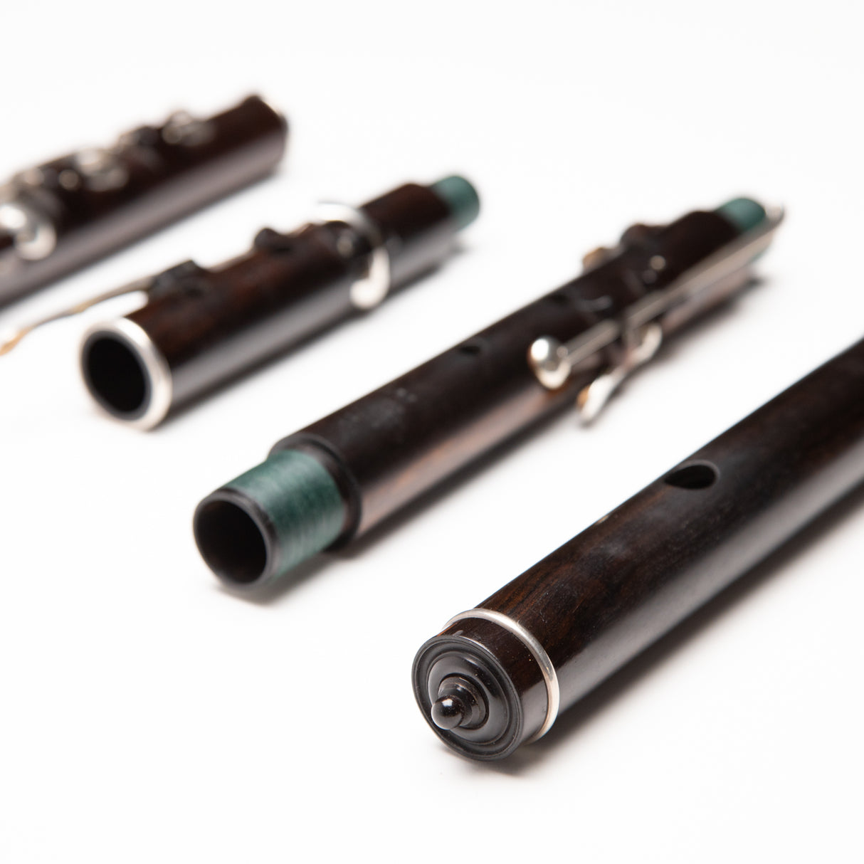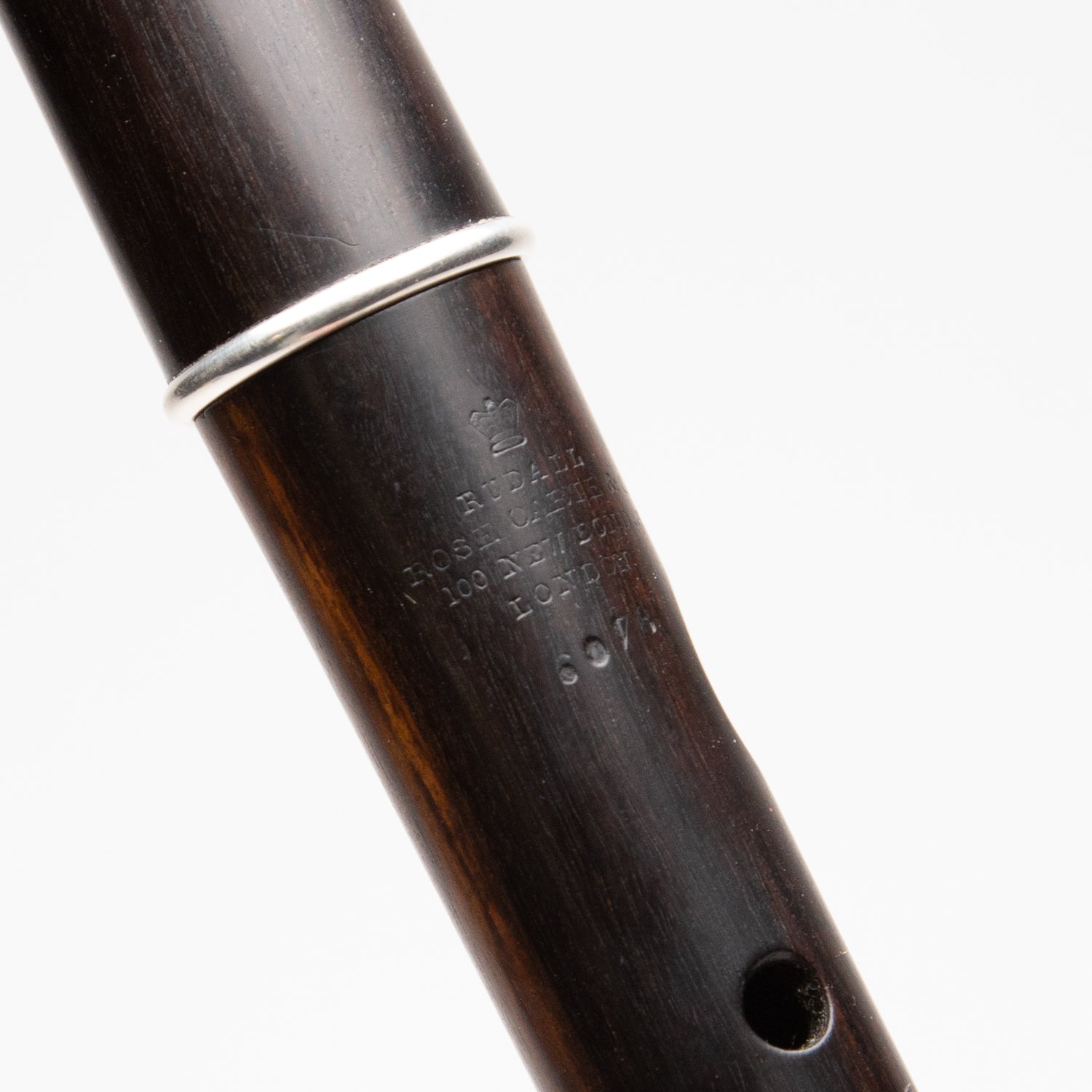 Condition: Antique ~1854 in excellent condition. Repairs to typical fine hairline cracks in barrel and back of headjoint. Recently overhauled by Jay Ham, who repadded it, changed the cork bumpers, adjusted key action, and retuned to bring it to modern pitch (using non-destructive shellac method). Plays at A440hz with slide extended approx 5mm.