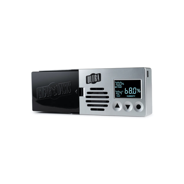 Like all Cigar Oasis humidifiers, the Ultra 3.0 comes preset to 70% RH but can be set easily to your preferred humidity level (we recommend 55%). The sensor constantly monitors the humidity which then activates the fan as needed to circulate moisture evenly keeping your flutes & whistles healthy & happy!