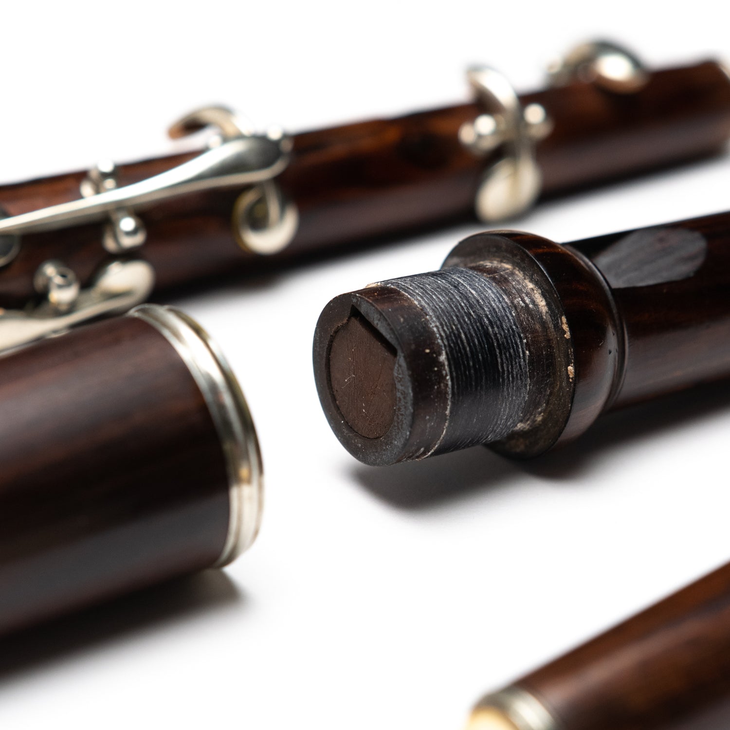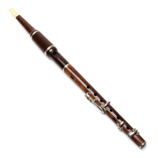 We've actually never had one of these in the shop before. Plays surprisingly well! Very interesting piece. Pitched in D / A440hz. 5 Keys. Barrel section has multiple repaired cracks (pictured).